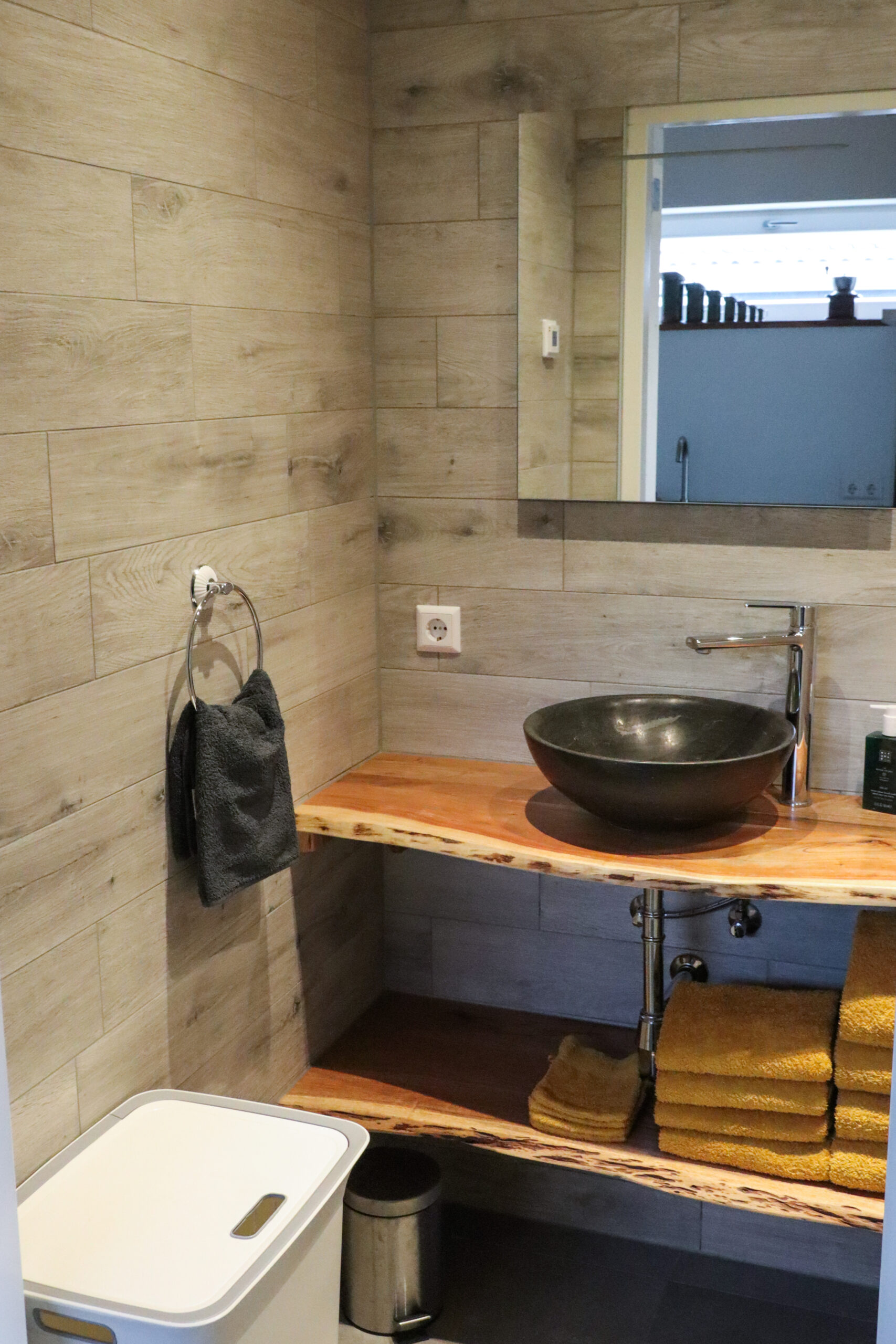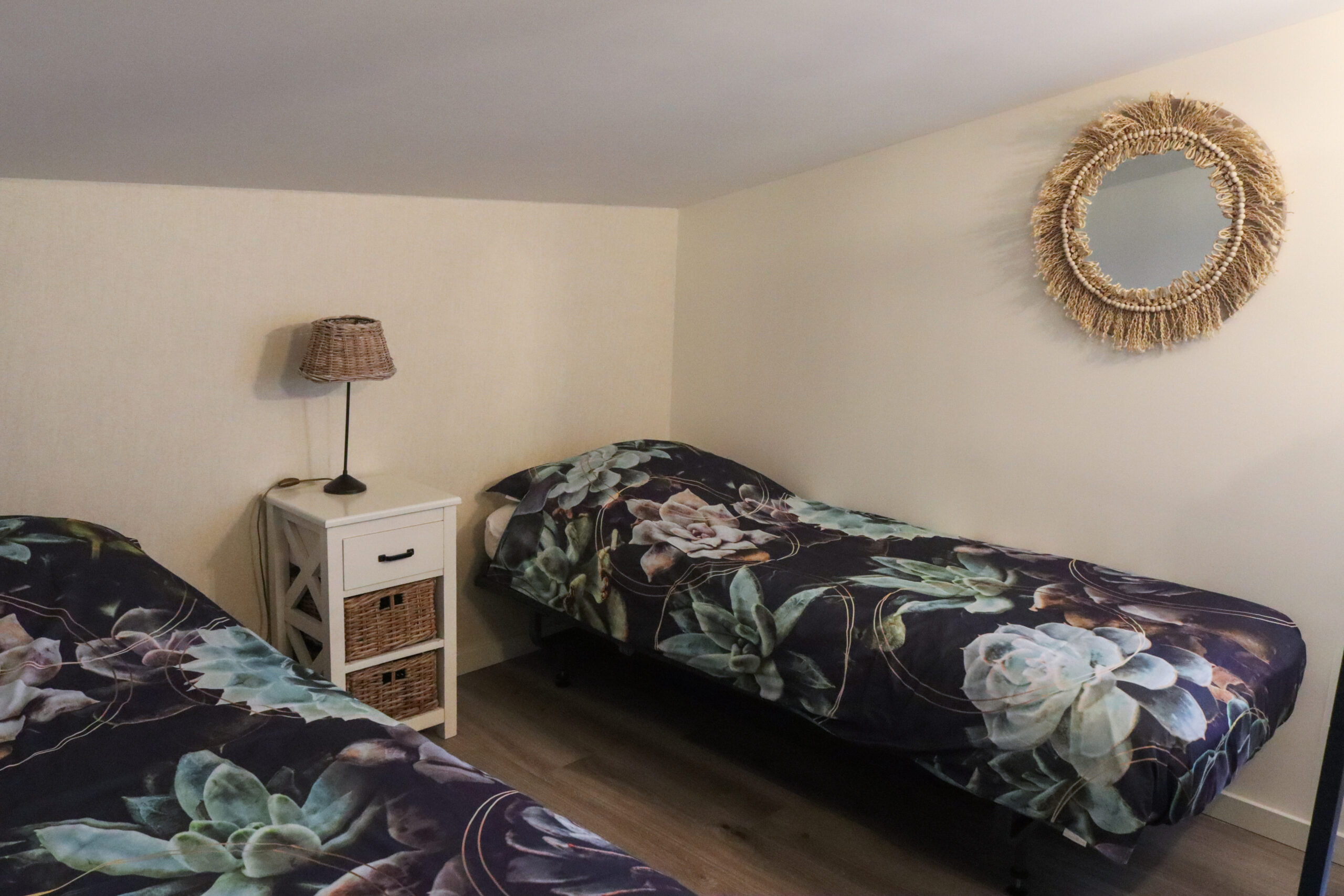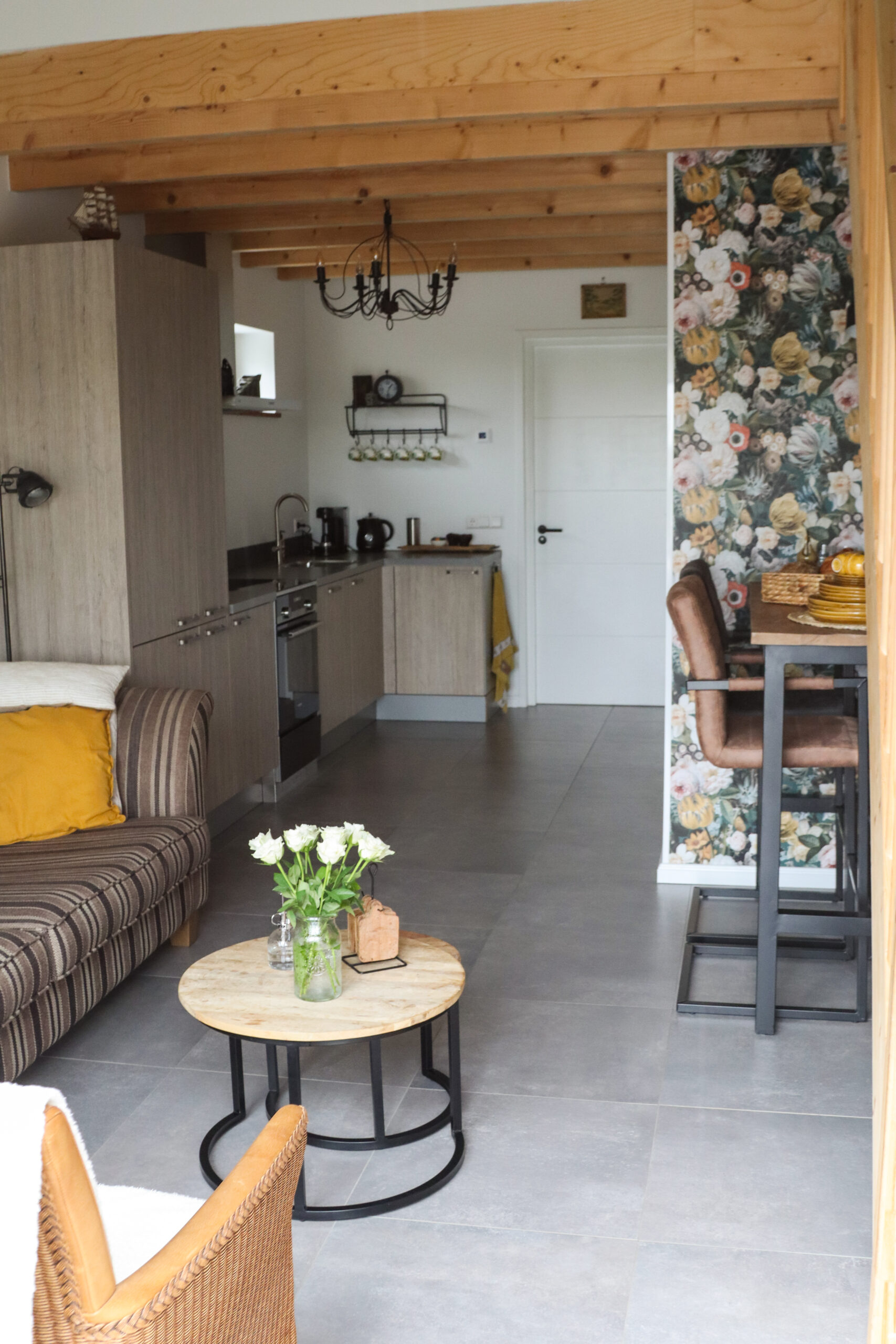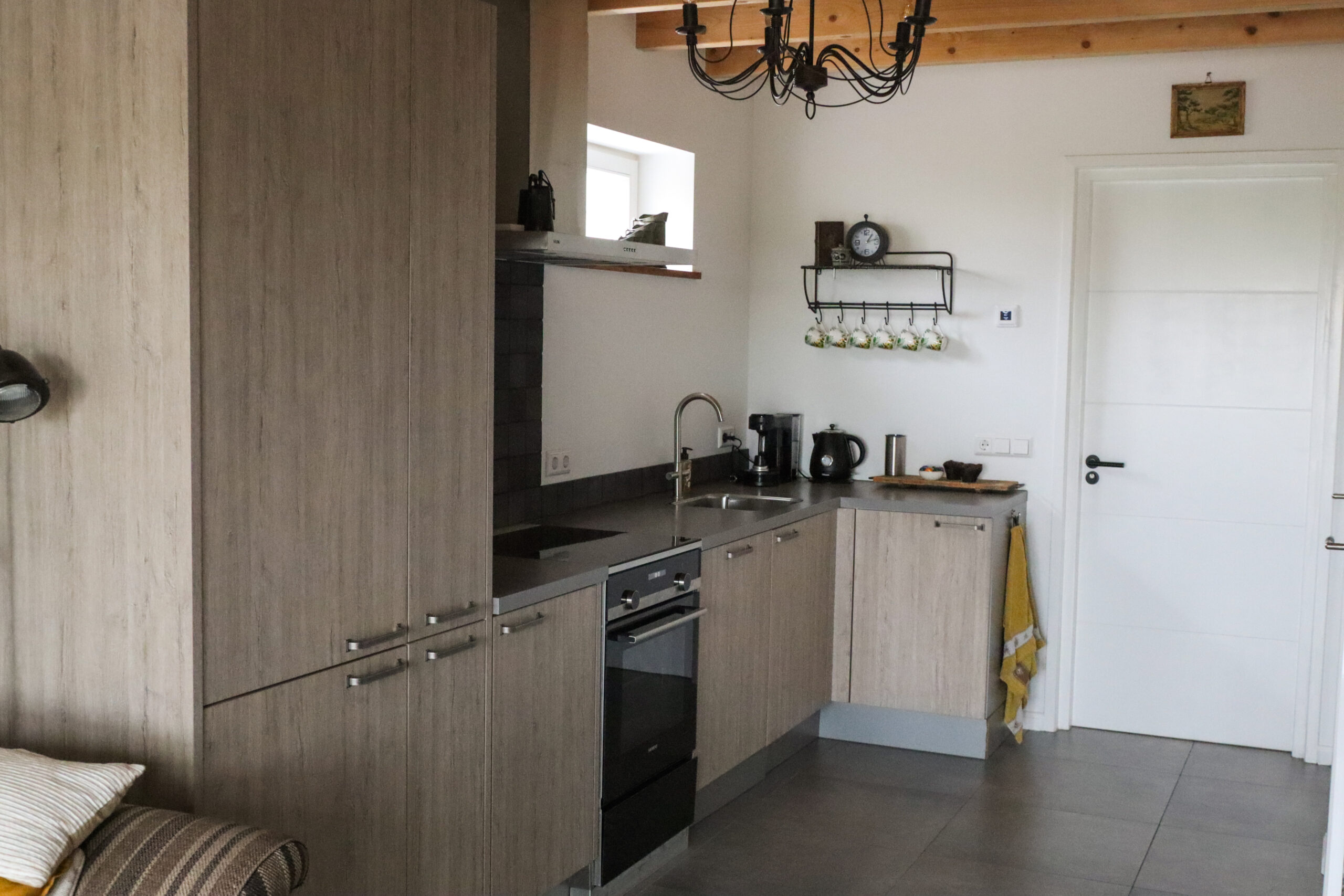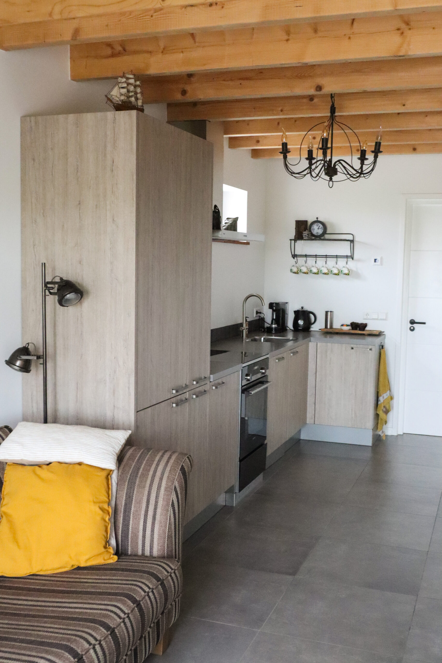Vanuit de hal komt u binnen in het appartement dat is voorzien van een mooie keuken, een zithoek en een wc en douche. Ga je de trap op, dan kom je op de bovenverdieping. Die is voorzien van twee slaapkamers: één ervan met een tweepersoonsbed en de andere heeft twee eenpersoonsbedden. De bedden zijn opgemaakt. Alles is inclusief bed-, bad-, en keukenlinnen.
